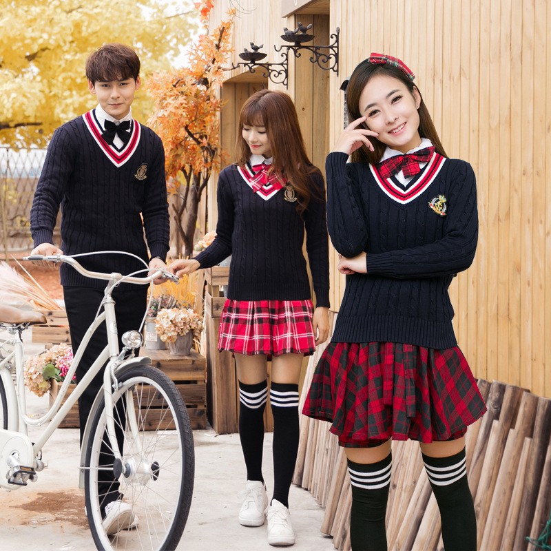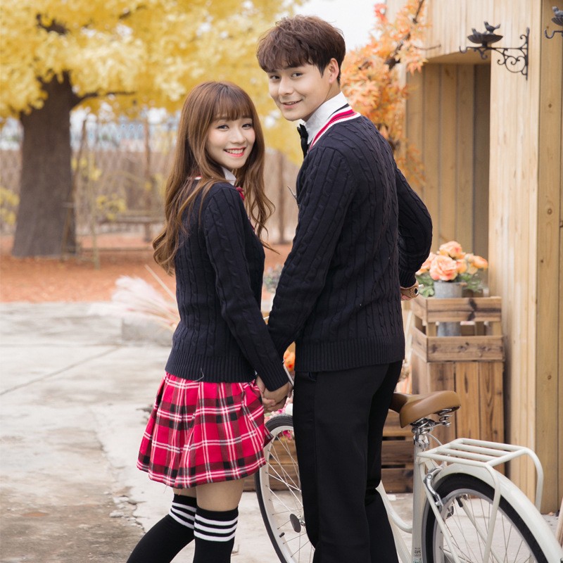 مجموعة التريكو الأنيقة هذه تجمع بين الحياكة الكبلية التقليدية وأسلوب المدرسة المعاصر. يضيف التشذيب المتباين على سترة الرقبة V لمسة نهائية حادة ، في حين تخلق التنورة المرقعة والجوارب العالية في الركبة مظهرًا متماسكًا ونابضًا بالحياة مثاليًا لبناء هوية مدرسية إيجابية.
