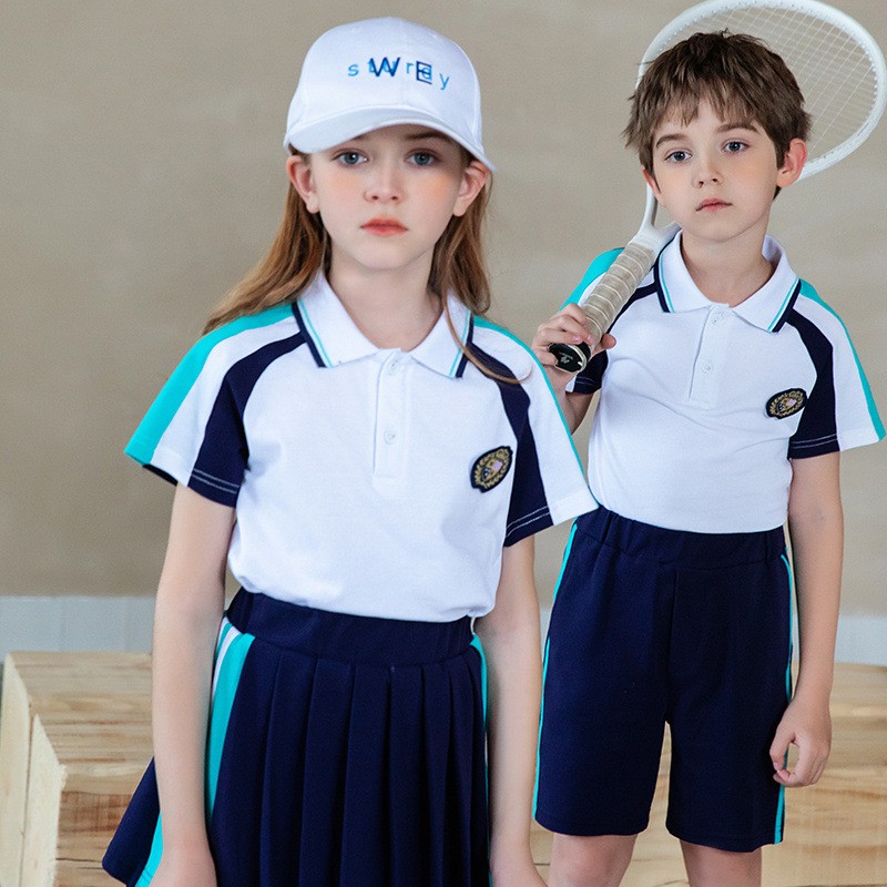 تصميم حسب نوع الجنس: تتشارك مجموعات الأولاد والبنات تصميم قميص بولو نفسه بينما تتميز من خلال السراويل القصيرة المخصصة (الأولاد) والتنورات المطوية (البنات) مع خطوط جانبية متطابقة من الشاي الأبيض