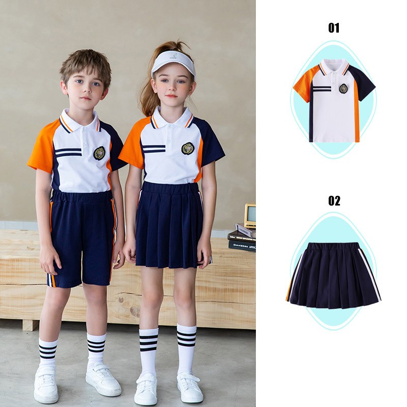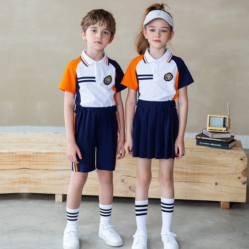 تصميم قابل للتكيف بين الجنسين: يرتدي جميع الطلاب نفس قميص بولو مع شارة المدرسة ، في حين يتميز الأولاد بشورت مخطط برتقالي وأبيض ويرتدي البنات تنورات كحلي مطوي بلهجات جانبية بيضاء