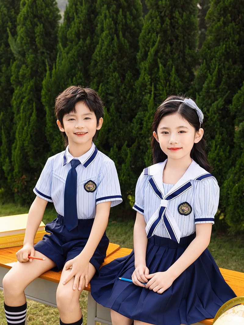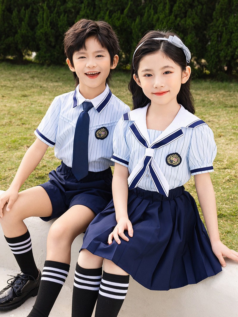 Boys-Striped Shirt, Formal Shorts Girls-Sailor Collar Shirt, Pleated Skirt, Bow Tieوصف المنتج