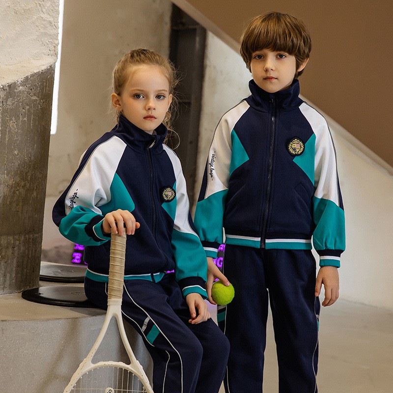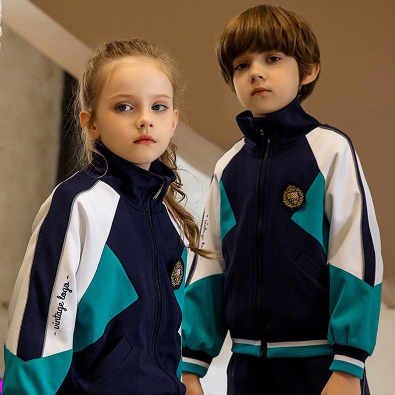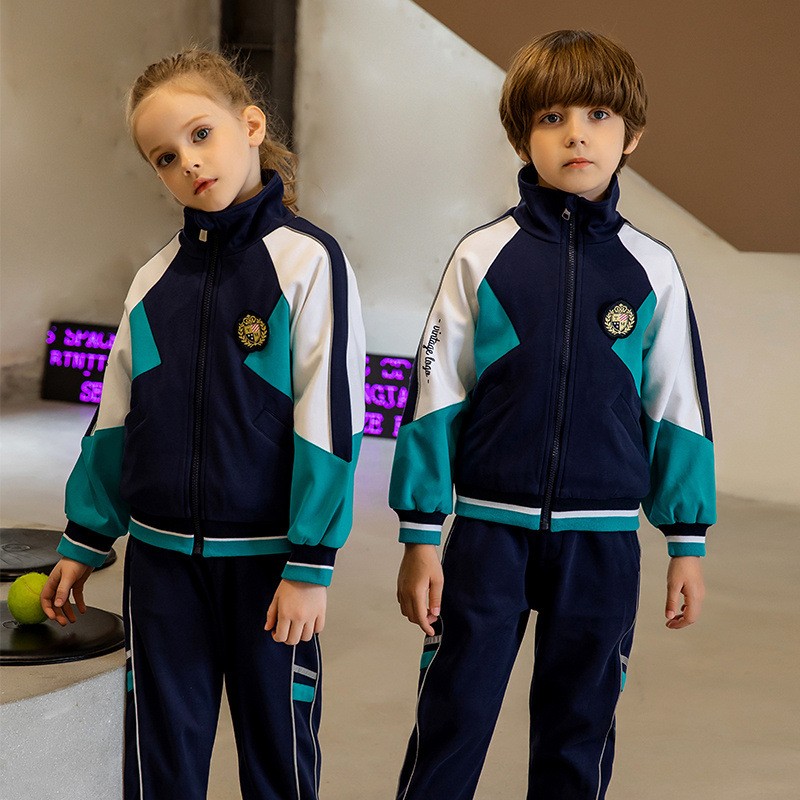 تصميم رياضي حديث: يتميز بجاكيت أنيق بياقة قائمة وبنطال رياضي عصري مع حجب الألوان ، مما يخلق مظهرًا رياضيًا وعصريًا يحبه الأطفال.